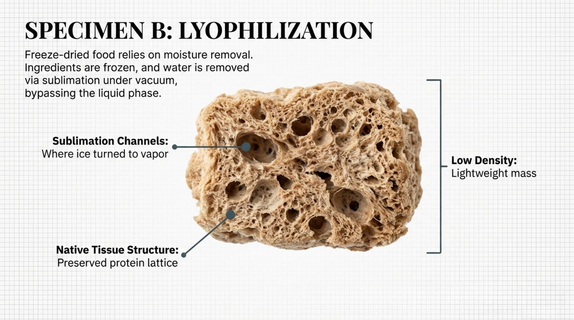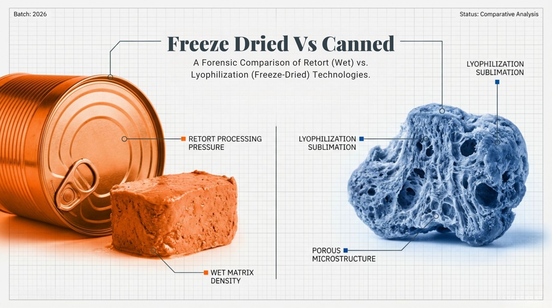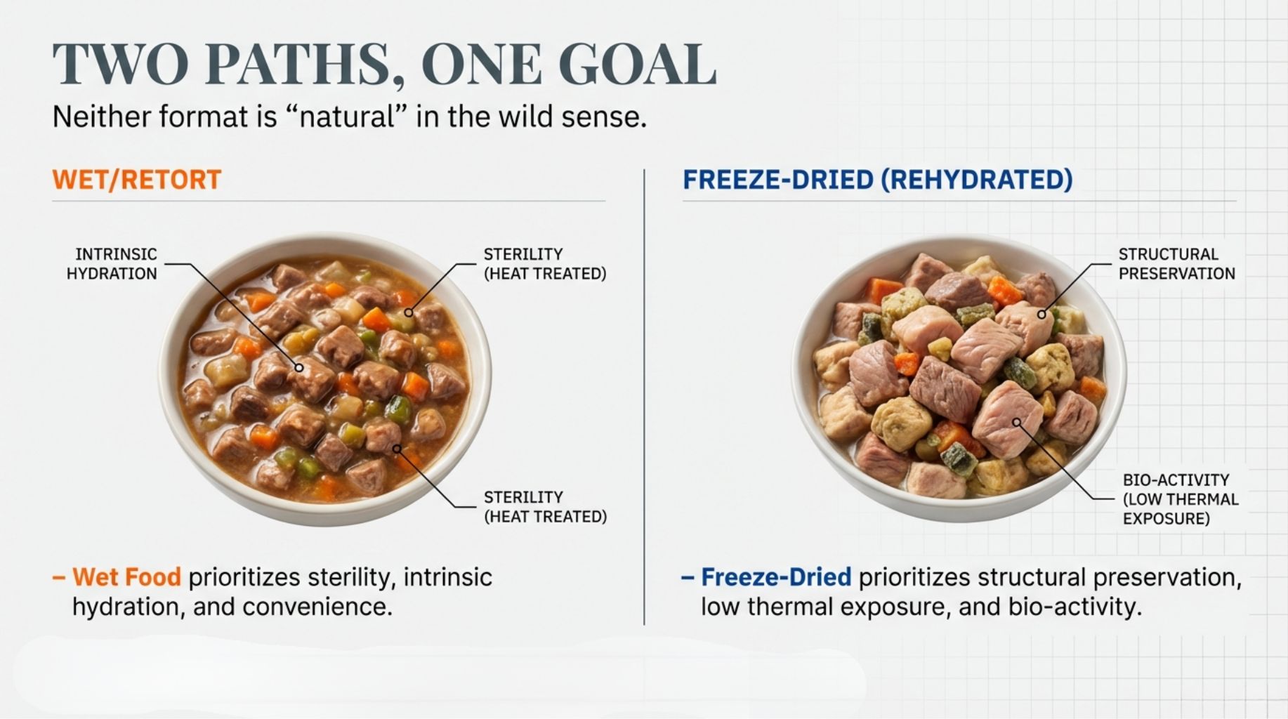 Wet pet food prioritizes absolute sterility and intrinsic hydration through high-heat cooking. Freeze-dried food prioritizes the structural preservation of nutrients, proteins, and enzymes through low-thermal dehydration. Neither format bypasses biological carnivore requirements, but each represents a distinct set of processing tradeoffs within modern commercial pet nutrition.