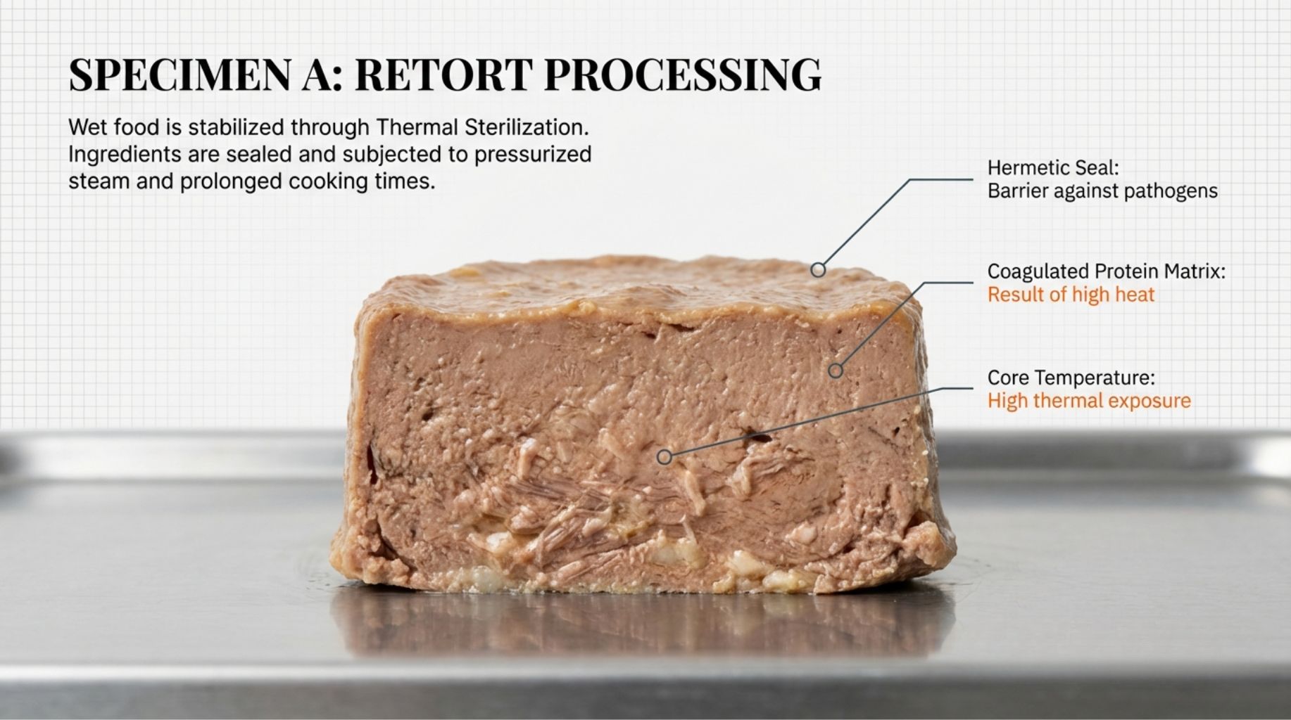 Retort processing fully inactivates all naturally occurring digestive enzymes present in raw meat. When a dog or cat consumes wet food, their own pancreas must generate the entire enzymatic load required to break down the sterilized material.