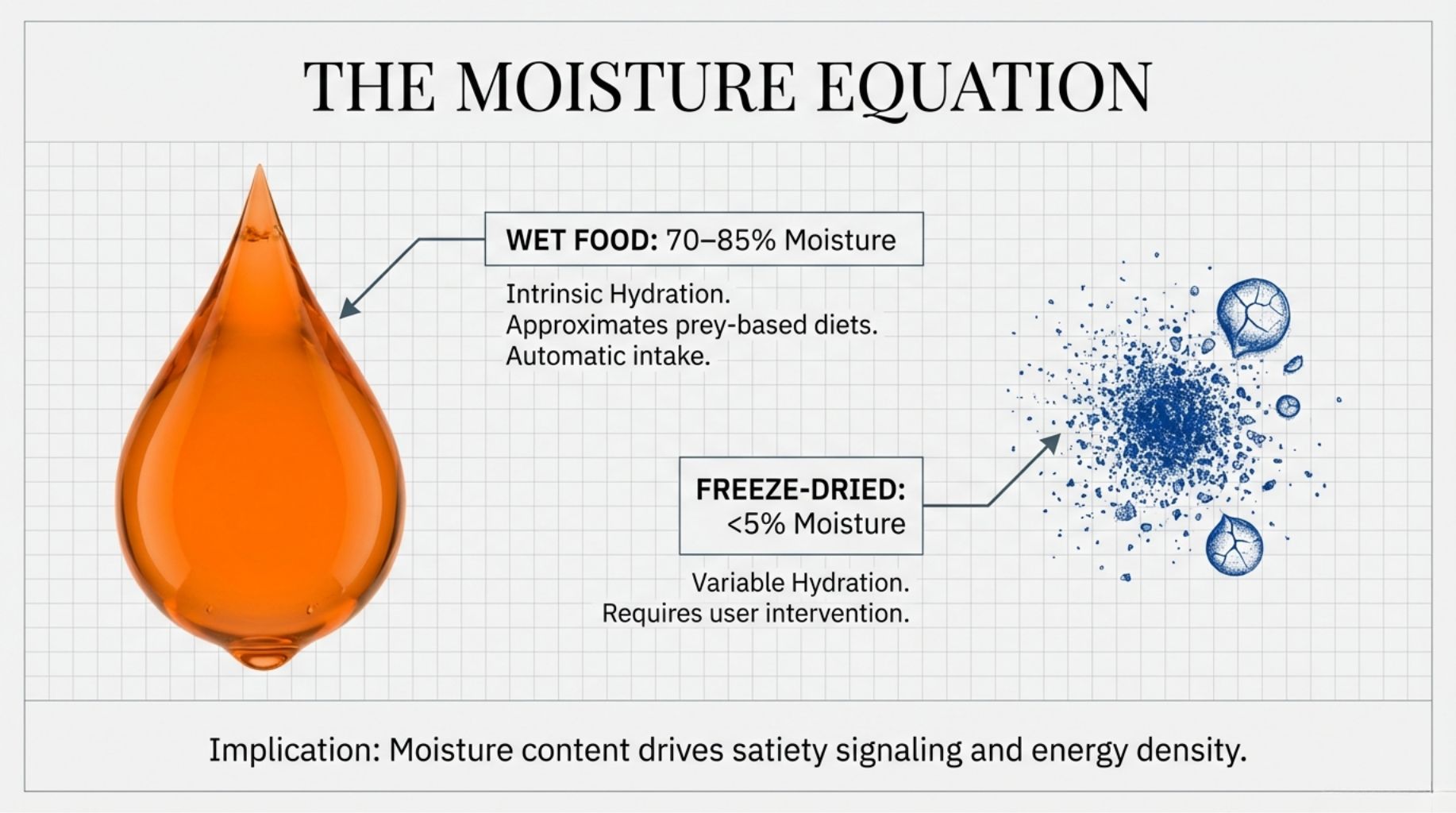 Moisture differences actively influence feeding volume, satiety signaling, and hydration status. Cats, in particular, possess a low voluntary thirst drive and benefit immensely from the intrinsic hydration provided by wet food or fully rehydrated freeze-dried diets to flush their renal systems and maintain concentrated, healthy urine specific gravity.