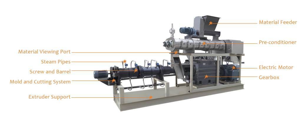 This hydrated blend passes through a pre-conditioning chamber before entering the extruder barrel. Pre-conditioning initiates hydration, begins partial starch gelatinization, and raises the temperature of the mixture so it enters the extruder in a plasticized state.²
