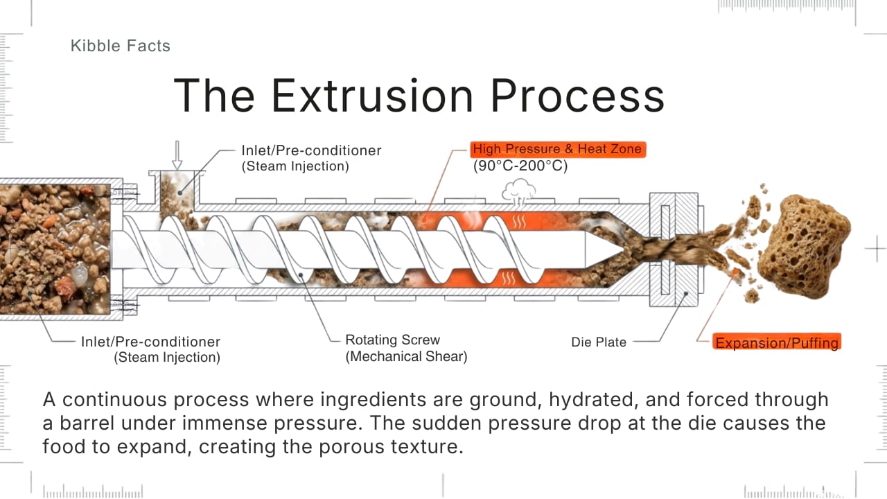 It defines kibble structurally, chemically, and economically. Understanding extrusion clarifies why dry pet food: