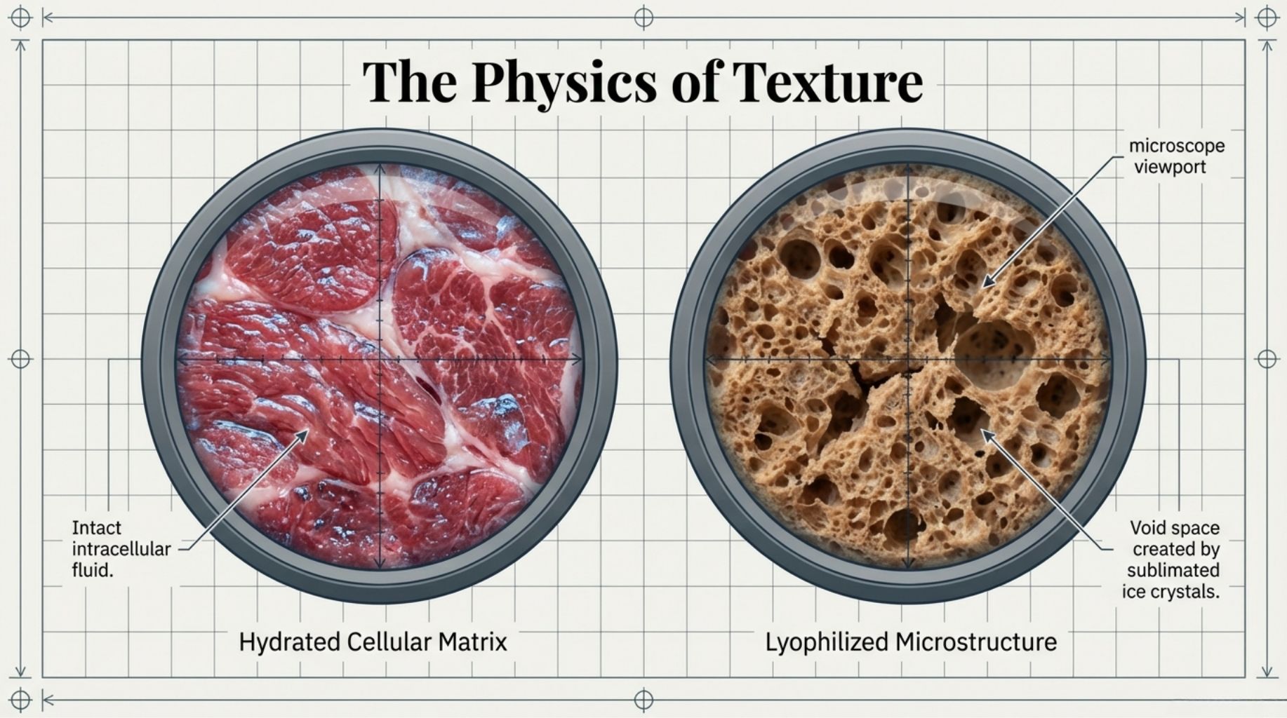 Conversely, freeze-dried raw pet food undergoes lyophilization. In a cold vacuum chamber, frozen moisture undergoes sublimation, transitioning directly from a solid (ice) to a gas (vapor) without ever passing through a liquid state. This allows the food to become completely shelf-stable while avoiding the severe thermal damage associated with traditional cooking or extrusion.