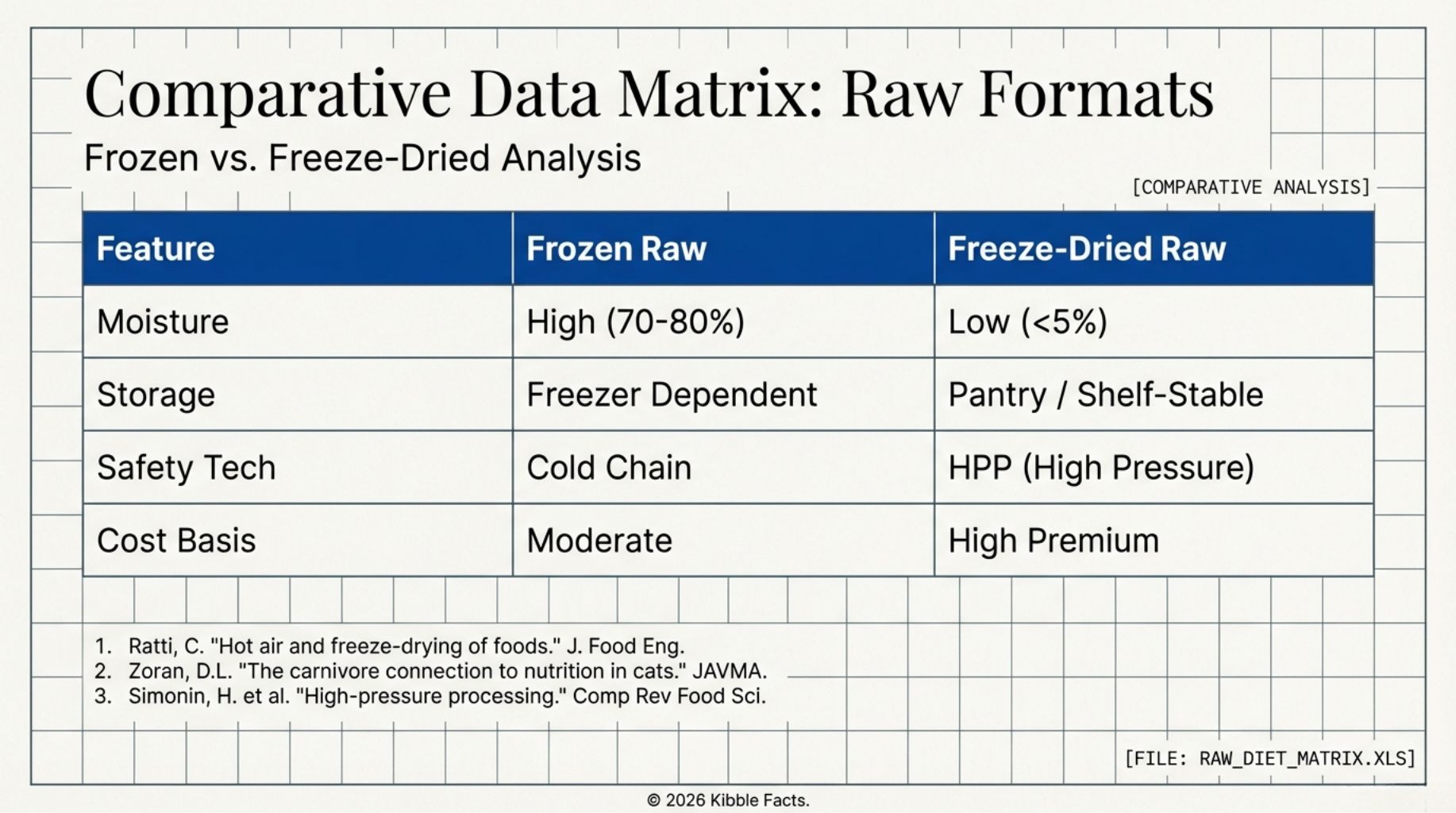 For pet owners seeking to bypass the metabolic stressors of commercial kibble, minimally processed diets represent the biological baseline. The two most prominent formats in this category are frozen raw and freeze-dried raw diets. Both formats provide highly bioavailable, species-appropriate nutrition, but they achieve stability and safety through distinctly different logistical and preservation mechanisms. Understanding the difference between sublimation and flash-freezing is critical for determining which format fits a household's feeding strategy.