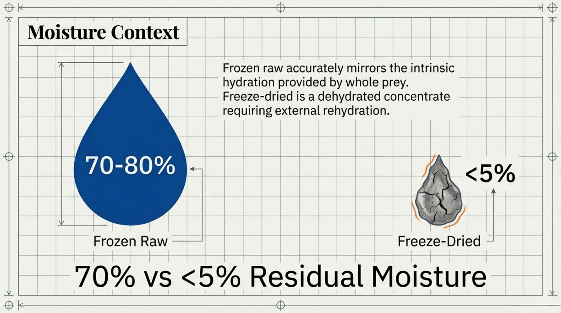Frozen raw food naturally contains 70% to 80% moisture, accurately mirroring the intrinsic hydration provided by whole prey. Freeze-dried food has nearly all of its moisture extracted, leaving a dry, lightweight product containing less than 5% residual water.