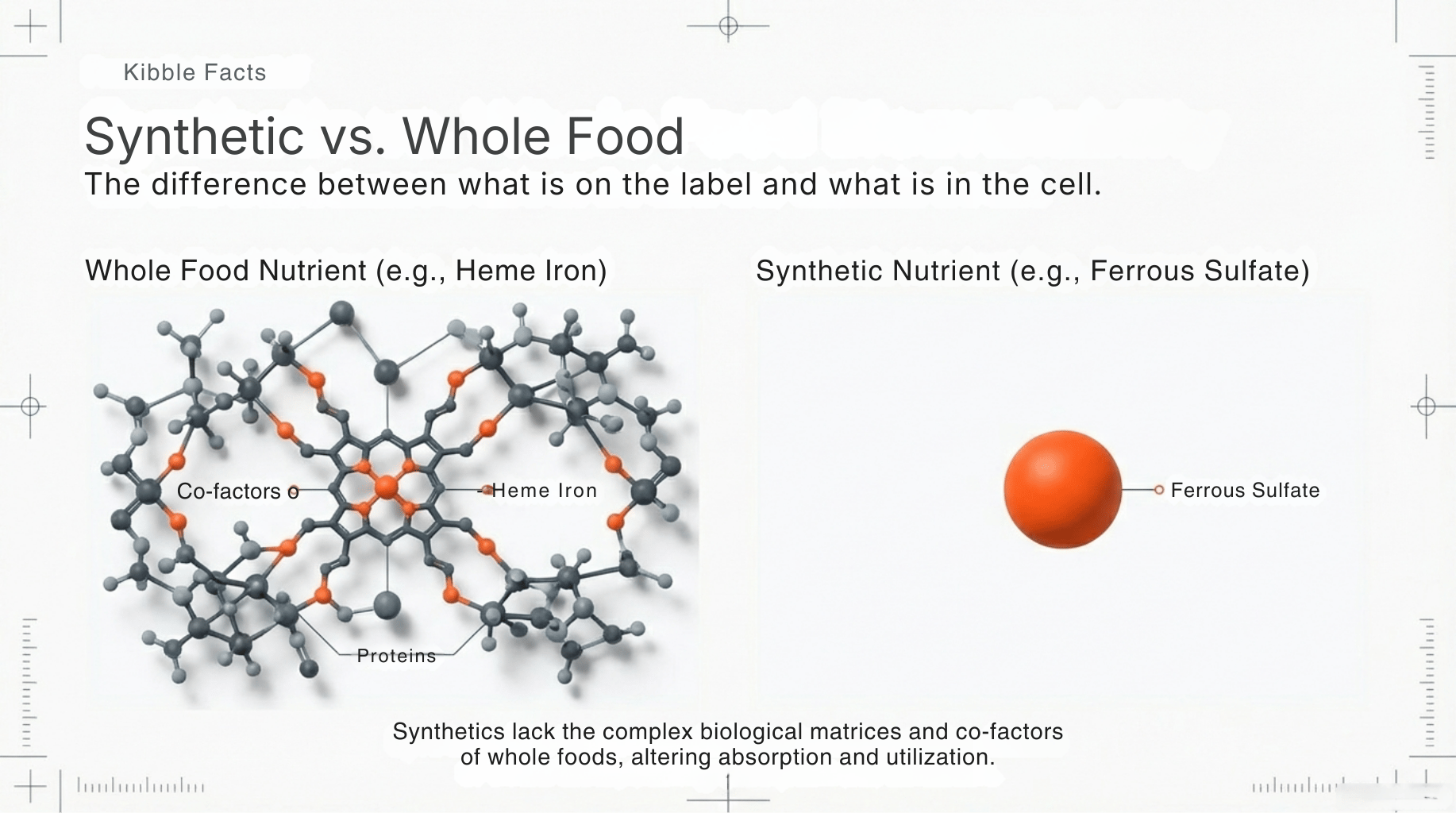 Synthetic nutrient fortification represents nutritional reconstruction, not nutritional preservation.It compensates for processing losses rather than maintaining food integrity. This distinction is central to understanding how kibble meets regulatory standards while diverging from whole-food nutritional structure.