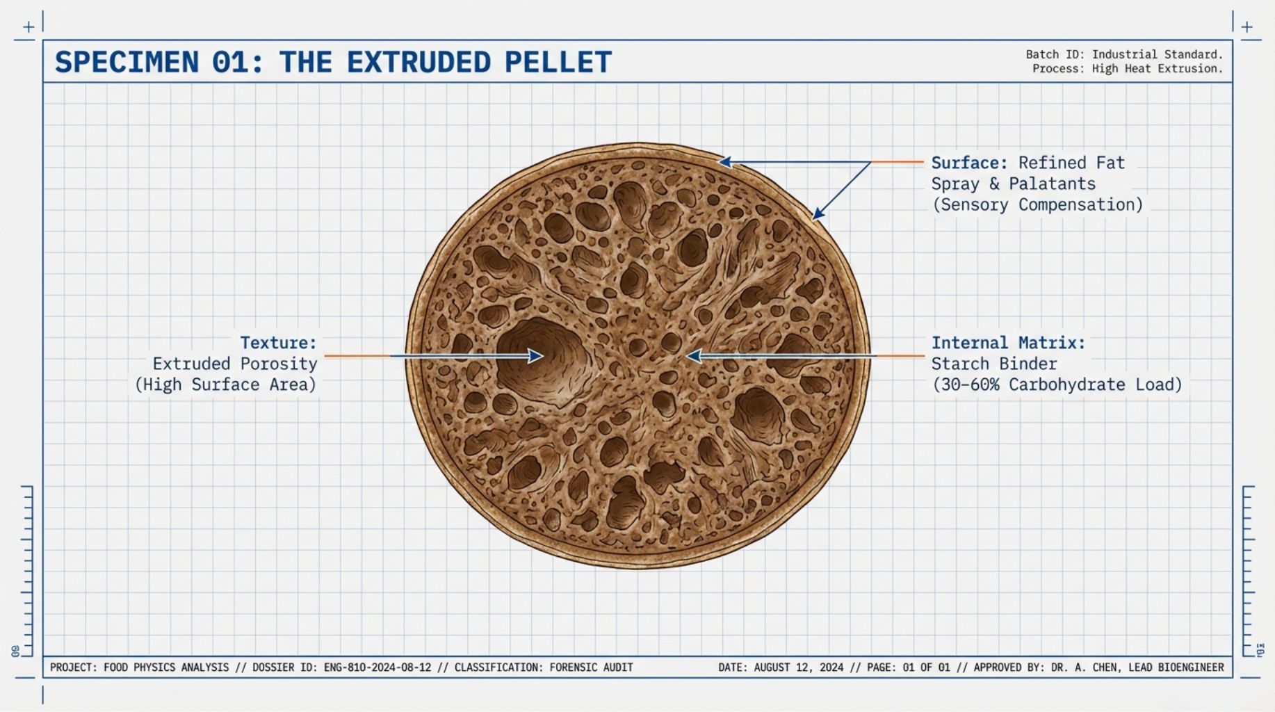 The Industrial Standard Kibble is the most common form of pet food, defined by its manufacturing method: extrusion. Ingredients are ground, mixed, and subjected to high heat and pressure inside a barrel before being pushed through a die.2